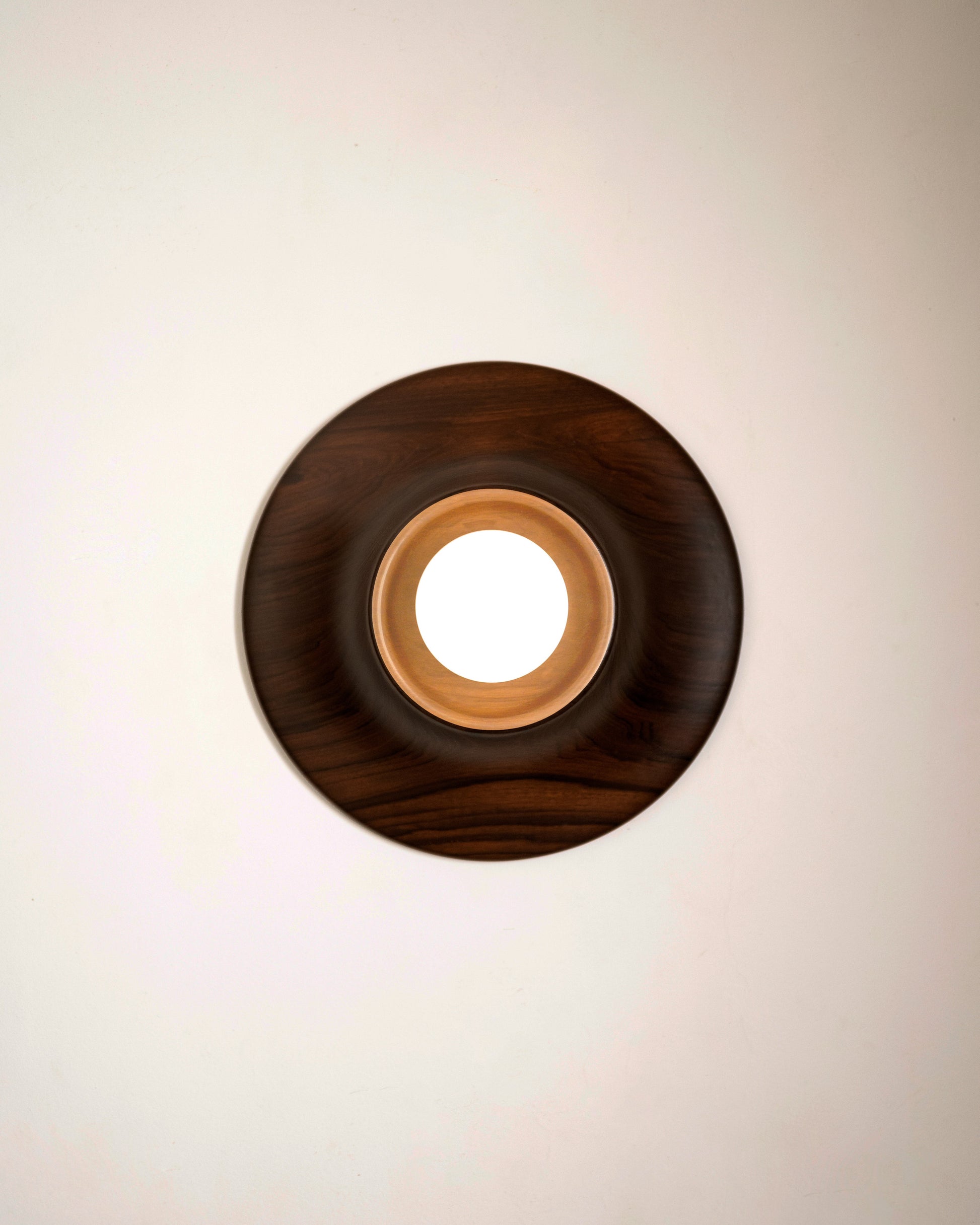 The Paten wall light offers a warm, understated glow that gently highlights the natural grain of the wood. Designed to sit flush with the wall, its clean circular form feels seamless and refined.