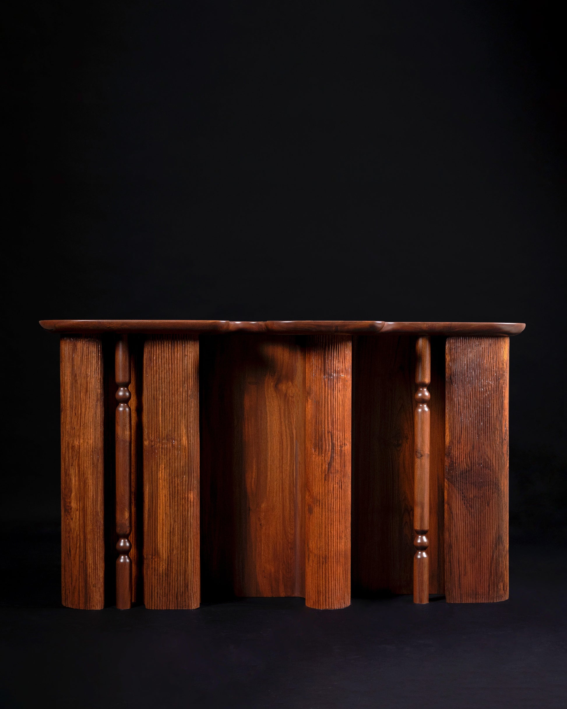 The Ridge console echoes of traditional techniques and elements in its voluminous form. The piece speaks of grandeur owing to its details, proportions and meticulously handcrafted structure. The grooves along its height, sleek wood turned legs as accents and an organic, yet amply functional top give the console a striking identity.