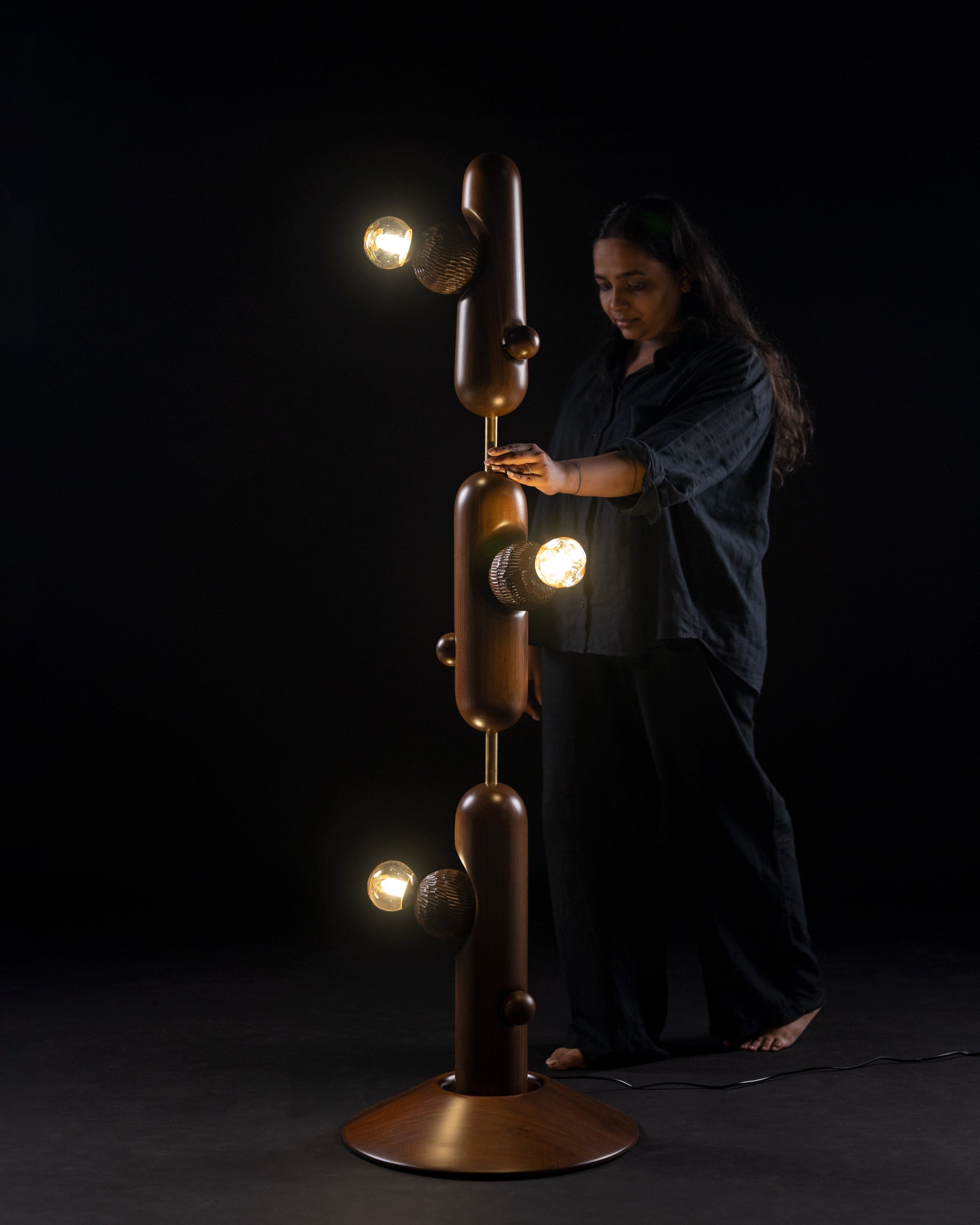 The Cactus floor lamp, handcrafted in teak wood, gives a soft illumination, while highlighting its hand-carved details and the wooden grain. The lamp is equal parts of quirk and elegance; a piece that's not just a floor lamp but a sculptural addition to a space.