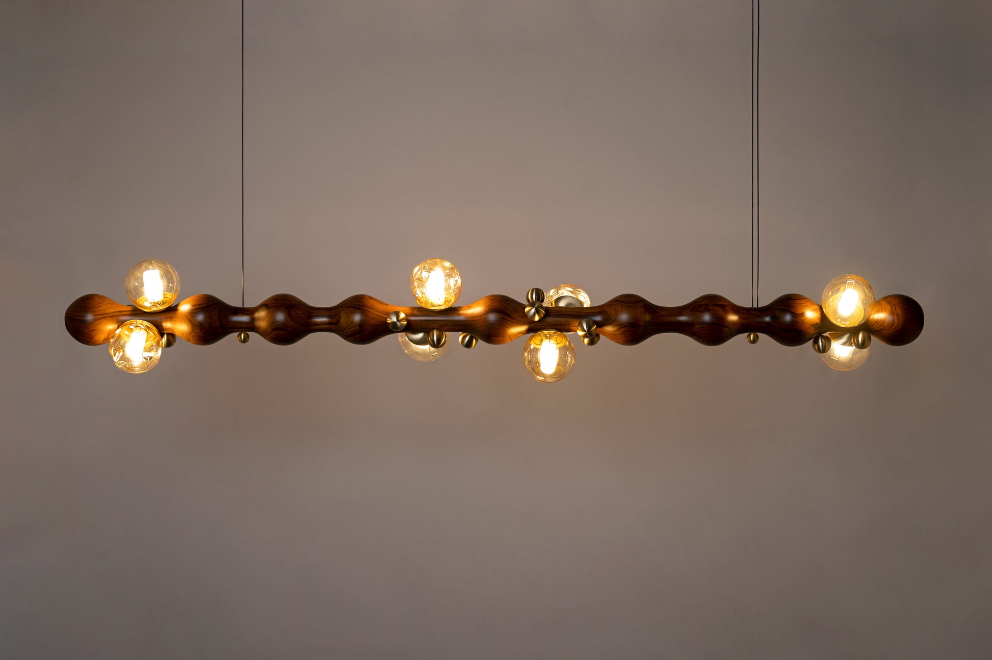 The Stem Suspended Ceiling Light, stuns in its simple form, with its soft light glowing on its bulbous parts. The tinted glass globes compliment the wood perfectly, giving wood the centre stage, highlighting the profile and grains of the wood.