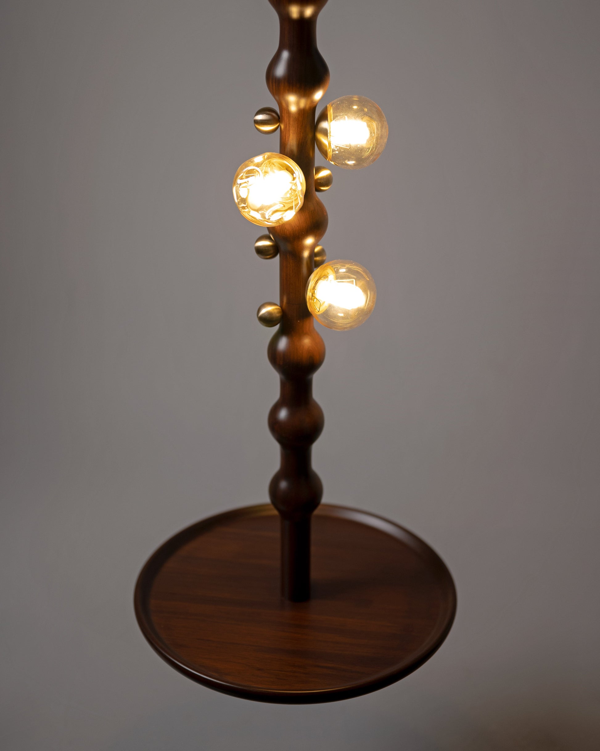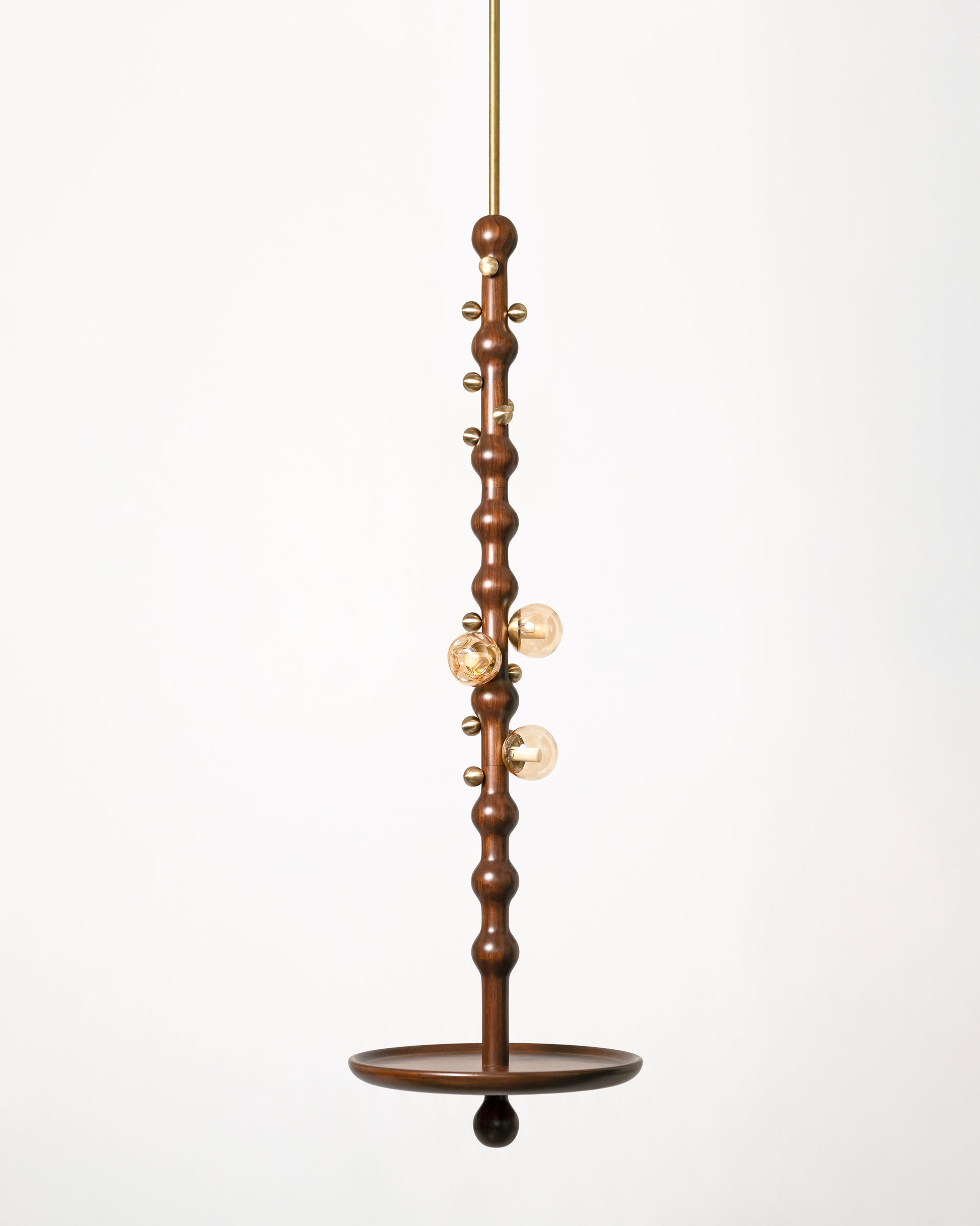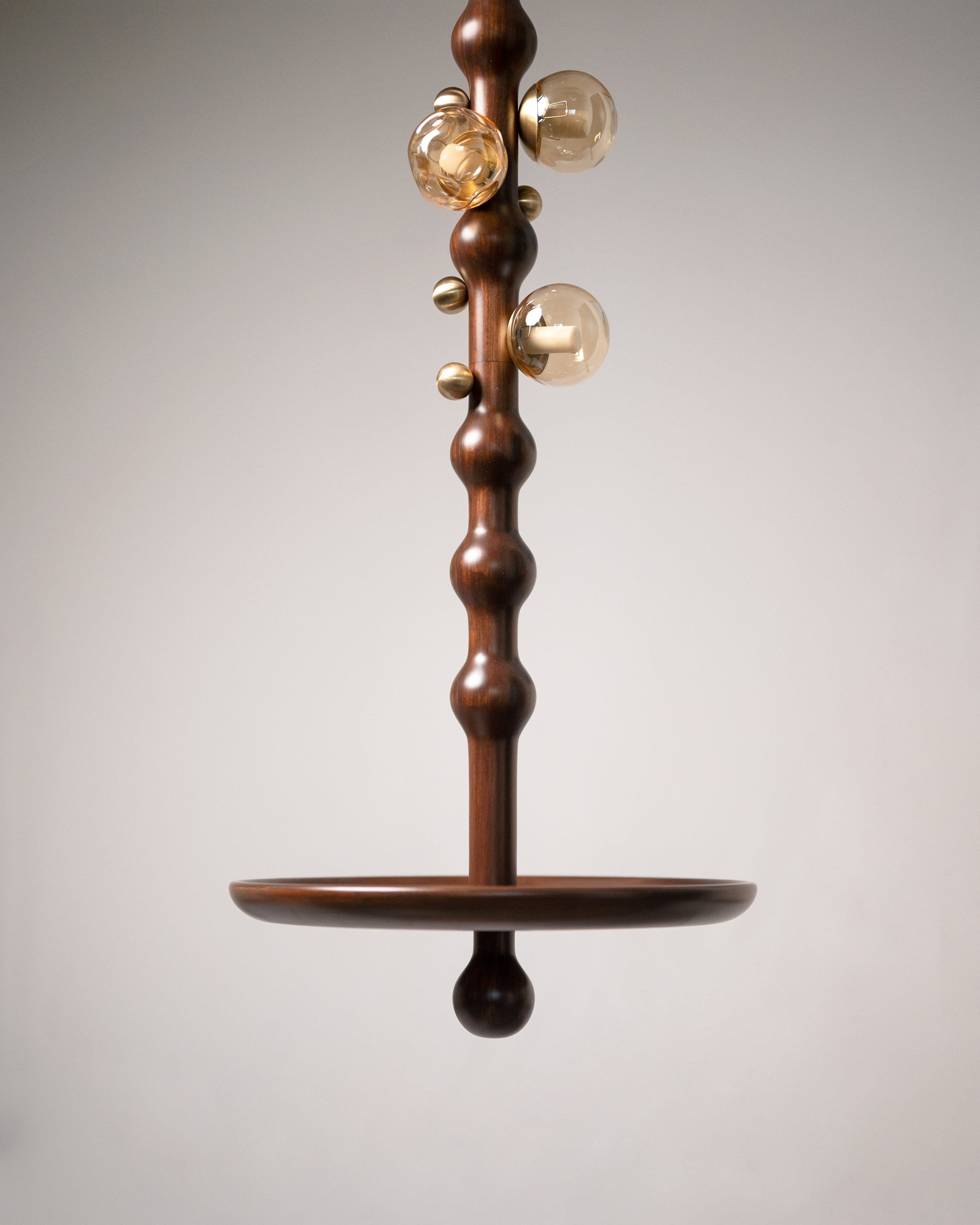 The Stem pendant light, stuns in its simple form, with its soft light glowing on its bulbous parts. A plate hangs at the bottom, acting like a side table. The Stem pendant becomes a perfect combination of a suspended light and side table, an addition to your bedsides and corners that is subtle, unique and of utmost function all at once. The tinted glass globes compliment the wood perfectly, giving wood the centre stage, highlighting the profile and grains of the wood.